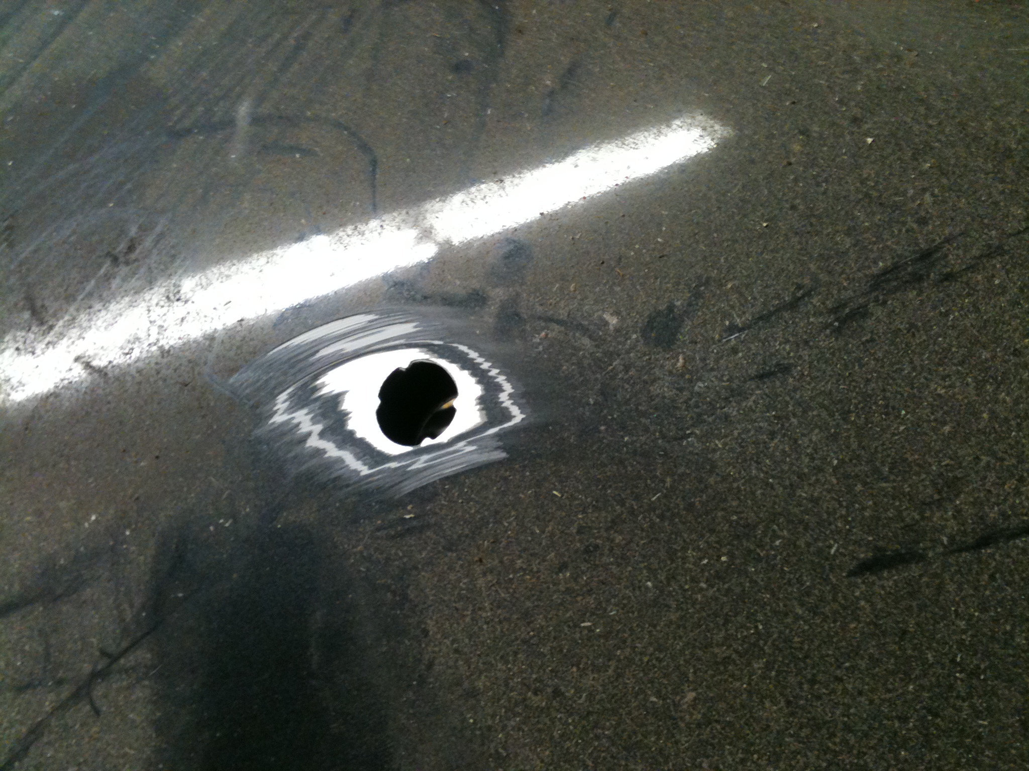 Bevor es weitergeht muss der Lack an der Stelle entfernt werden damit beim schweißen keine Probleme durch Schlechte Masse zustande kommt. Die 2 Löcher in der Haube sollten dann nun so aussehen: